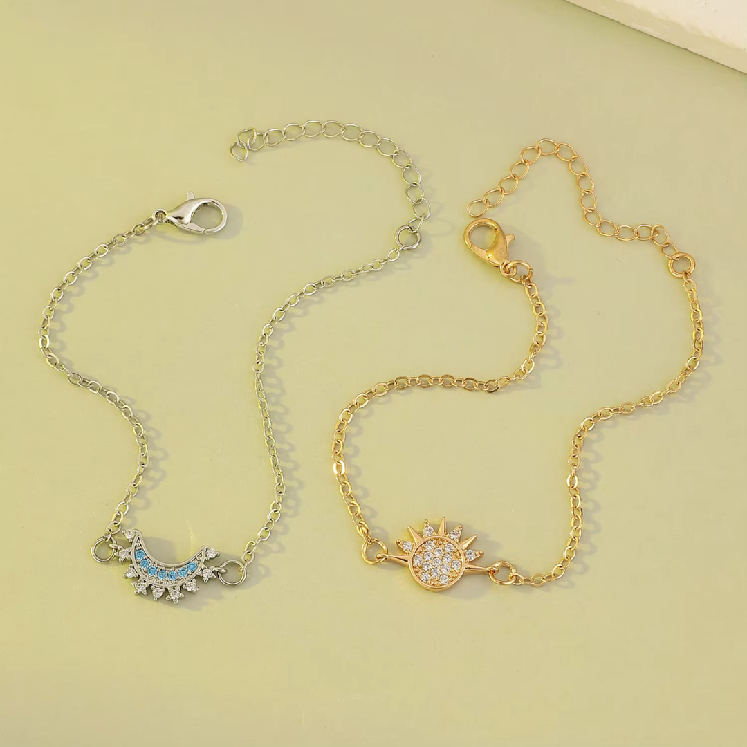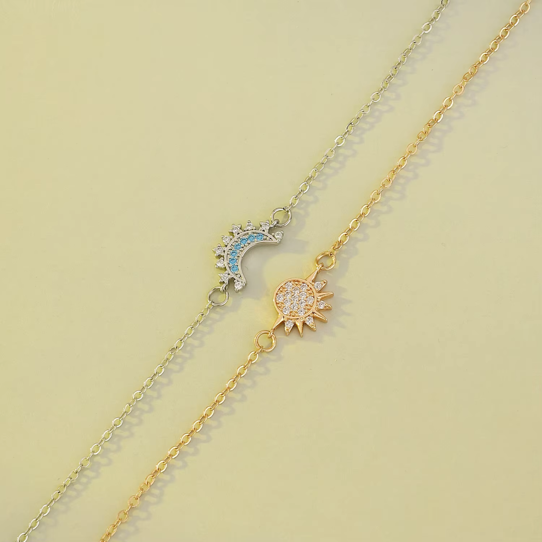 Un set raffinato che celebra l’armonia tra il sole e la luna, simboli di luce e oscurità. Il bracciale e l’anello sono realizzati con materiali di alta qualità, con dettagli curati che raffigurano un sole radiante e una luna crescente. Il design elegante e minimalista li rende perfetti per ogni occasione, unendo stile e significato in un accessorio unico.